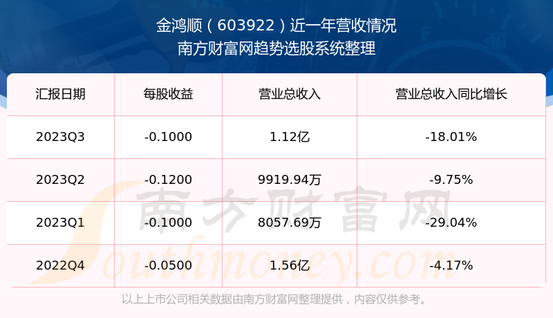 金鸿顺2023年第三季度财报显示,公司主营收入1.12亿元,同比-18.01%;归母净利润-1282.54万元,同比-340.57%;扣非净利润-1380.41万元,同比-287.84%。