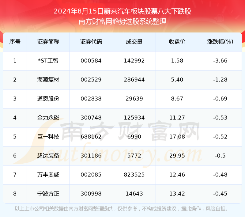 截止2024年8月15日,个股表现方面,蔚来汽车板块股票当日领跌股为*ST工智(000584),该股当日报收1.58,上涨-3.66%,成交量14.3万。海源复材(002529)以下跌-1.28%紧随其后,该股当日成交量28.69万。此外,道恩股份(002838)、金力永磁(300748)、巨一科技(688162)均进入当日蔚来汽车板块股票下跌股之列。