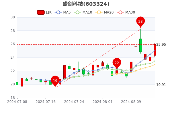 8月16日,盛剑科技(603324)5日内股价上涨3.03%,今年来涨幅下跌-26.17%,涨8.02%,最新报24.140元/股。