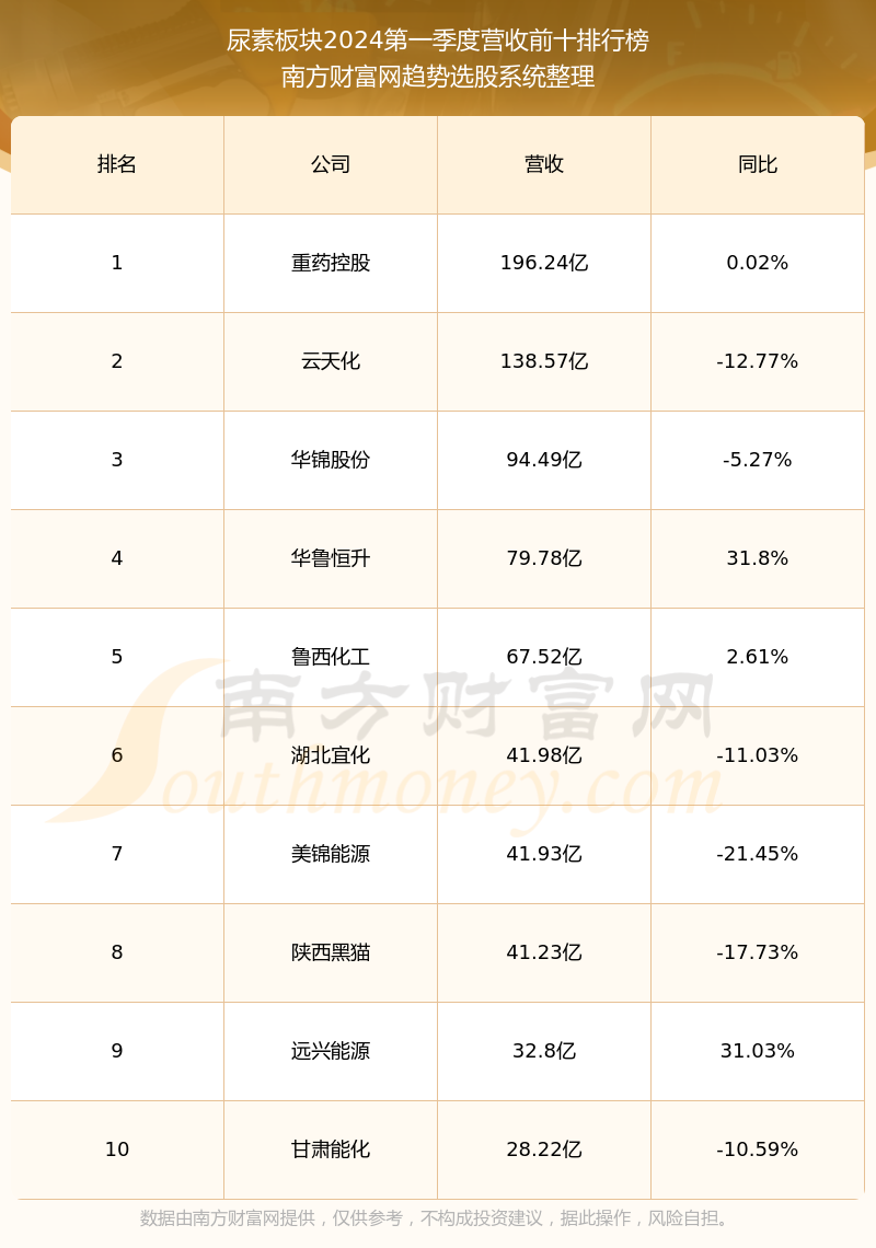按照南方财富网趋势选股系统统计,该股所属板块为尿素板块,该板块共有24只股票,阳煤化工2024第一季度营收在该板块中排名为第11名,该板块2024第一季度营收排名前十的股票如下表: