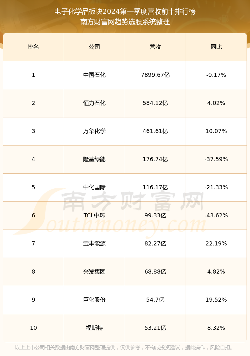 按照南方财富网趋势选股系统统计,该股所属板块为电子化学品板块,该板块共有60只股票,江化微2024第一季度营收在该板块中排名为第49名,该板块2024第一季度营收排名前十的股票如下表: