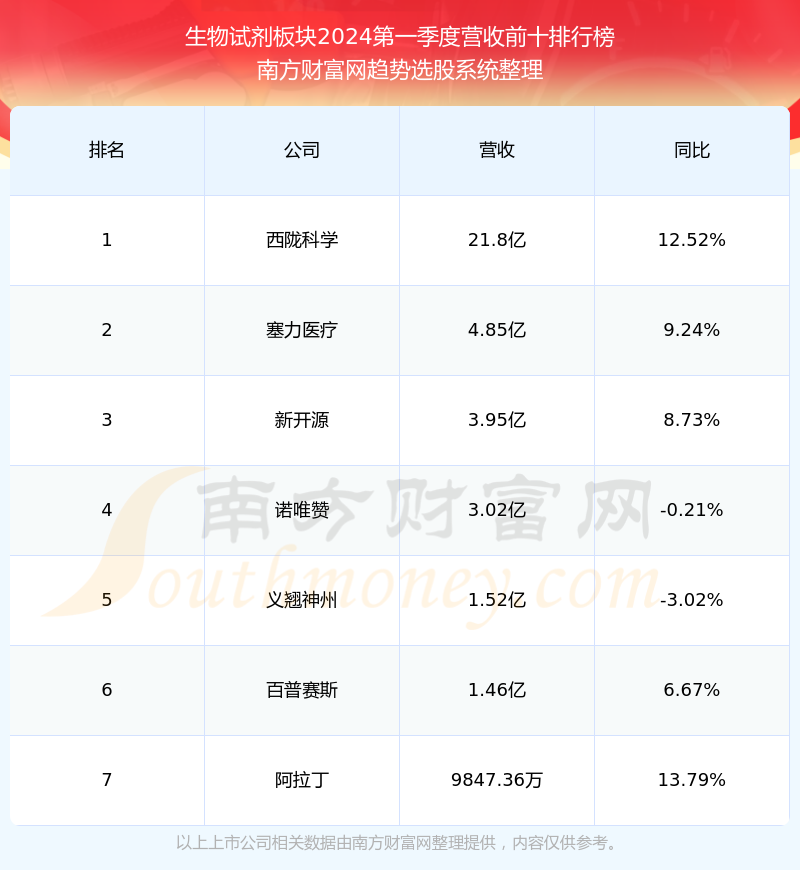 按照南方财富网趋势选股系统统计,该股所属板块为生物试剂板块,该板块共有7只股票,诺唯赞2024第一季度营收在该板块中排名为第4名,该板块2024第一季度营收排名前十的股票如下表: