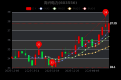 1月15日消息,15时收盘海兴电力报37.790元,较前一交易日涨0.32%。当日该股换手率0.91%,成交量达到了441.72万手,成交额总计为1.67亿元。 从盘面上看,所属的变压器出海板块收盘报涨,保变...