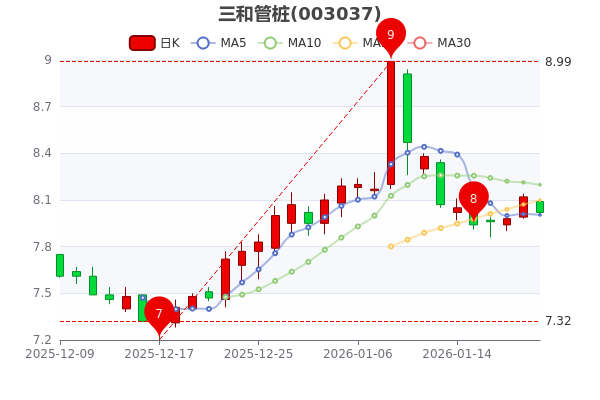 1月21日,三和管桩开盘报价8.09元,收盘于8.020元,跌1.23%。当日最高价为8.1元,最低达8元,成交量597.58万手,总市值为48.05亿元。