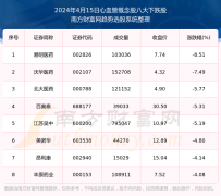 截止2024年4月15日,个股表现方面,心血管概念股当日领跌股为易明医药(002826),该股当日报收7.74,上涨-8.51%,成交量10.3万。沃华医药(002107)以下跌-7.49%紧随其后,该股当日成交量15.27万。此...
