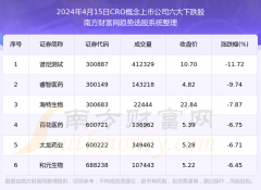 截止2024年4月15日,个股表现方面,CRO概念上市公司当日领跌股为谱尼测试(300887),该股当日报收10.70,上涨-11.72%,成交量41.23万。睿智医药(300149)以下跌-9.74%紧随其后,该股当日成交量14.3...