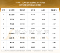截止2023年12月8日,个股表现方面,港口服务概念股当日领跌股为厦门港务(000905),该股当日报收7.05,上涨-2.76%,成交量9.12万。连云港(601008)以下跌-2.59%紧随其后,该股当日成交量11.99万。此...