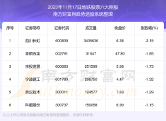截止2023年11月17日,个股表现方面,地铁股票当日领跌股为四川长虹(600839),该股当日报收6.38,上涨-2.15%,成交量343.56万。坚朗五金(002791)以下跌-1.85%紧随其后,该股当日成交量3.1万。此外...