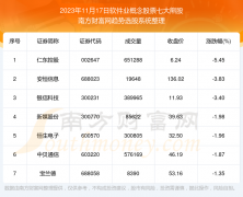 截止2023年11月17日,个股表现方面,软件业概念股票当日领跌股为仁东控股(002647),该股当日报收6.24,上涨-5.45%,成交量65.13万。安恒信息(688023)以下跌-3.83%紧随其后,该股当日成交量1.96万...