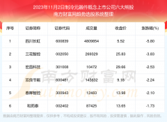 截止2023年11月2日,个股表现方面,制冷元器件概念上市公司当日领跌股为四川长虹(600839),该股当日报收5.52,上涨-5.80%,成交量480.99万。三花智控(002050)以下跌-3.83%紧随其后,该股当日成交...