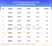 截止2023年11月1日,个股表现方面,建筑节能概念股票当日领跌股为万华化学(600309),该股当日报收85.50,上涨-3.72%,成交量11.44万。雅克科技(002409)以下跌-3.14%紧随其后,该股当日成交量9....