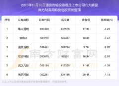 截止2023年10月30日,个股表现方面,通信传输设备概念上市公司当日领跌股为烽火通信(600498),该股当日报收17.99,上涨-4.21%,成交量44.76万。金信诺(300252)以下跌-3.47%紧随其后,该股当日成...