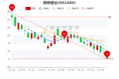 12月22日消息,赣锋锂业开盘报74.9元,截至下午三点收盘,该股跌2.9%,报72.200元。换手率1.67%,振幅跌2.91%。 从盘面上看,所属的汽车产业板块收盘报跌,赣锋锂业(72.200,...
