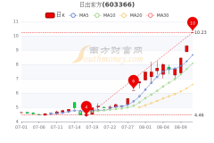 8月11日消息,日出东方开盘报价10.23元,收盘于10.23元,涨10%。今年来涨幅上涨48.48%,市盈率38.52。 从盘面上看,所属的太阳能热水器板块盘后报涨,日出东方(10.000)领涨...