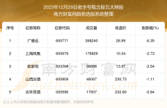 截止2023年12月29日,个股表现方面,老字号概念股当日领跌股为广誉远(600771),该股当日报收26.99,上涨-6.35%,成交量26.82万。上海凤凰(600679)以下跌-2.73%紧随其后,该股当日成交量17.88万。此...