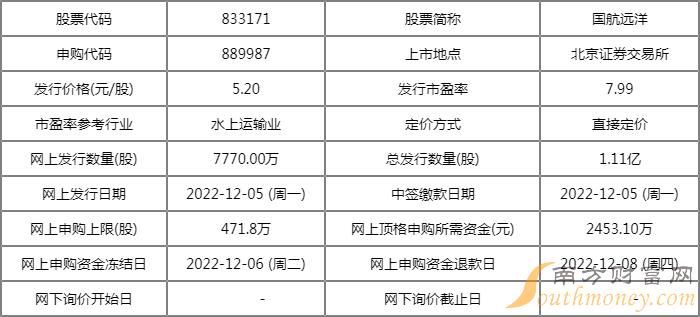 福建的国航远洋运输(集团)股份有限公司将北京证券交易所上市,上市申购时间为2022年12月05日,其股票代码833171,上市发行价:5.20元/股,总发行数量1.11亿/股。