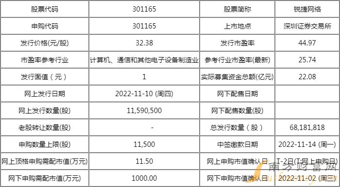 锐捷网络股份有限公司将深圳证券交易所上市,上市申购时间为2022年11月10日,其股票代码301165,上市发行价:暂无/股,总发行数量68,181,818股。