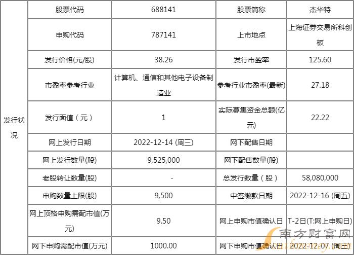 杰华特发行量为5808万股,网上发行952.5万股,于2022年12月14日申购,申购代码787141,单一账户申购上限9500股,申购数量500股整数倍。
