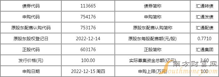 汇通集团(603176)本次发行可转债简称为“汇通转债”,代码为“113665”,发行规模为3.6亿元。本次发行的优先配售日和网上申购日为12月15日。