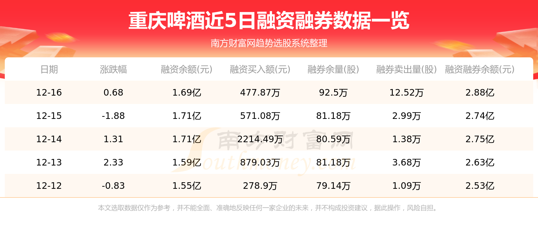 12月16日重庆啤酒融券信息显示,融资方面,当日融资买入477.87万元,融资偿还648.64万元,融资净买额-170.77万元。融券方面,融券卖出12.52万股,融券偿还1.2万股,融券余量92.5万股,融券余额1.18亿元。融资融券余额2.88亿元。近5日融资融券数据一览见下表: