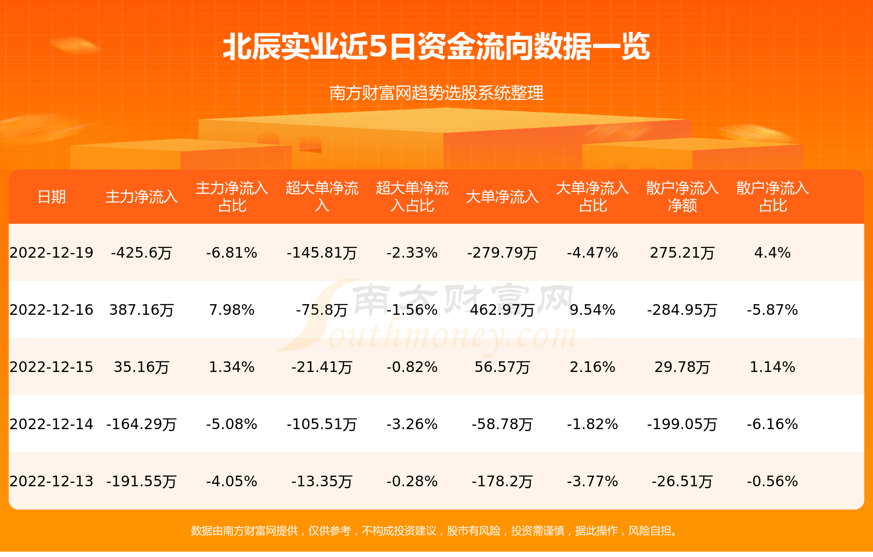 12月19日消息,北辰实业12月19日主力净流出425.6万元,超大单净流出145.81万元,大单净流出279.79万元,散户净流入275.21万元。