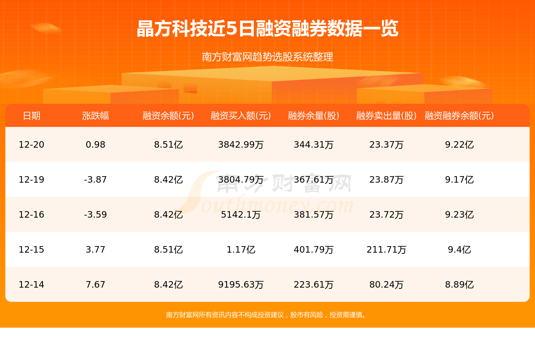 12月20日晶方科技融券信息显示,融资方面,当日融资买入3842.99万元,融资偿还2896.87万元,融资净买额946.12万元。融券方面,融券卖出23.37万股,融券偿还46.67万股,融券余量344.31万股,融券余额7089.37万元。融资融券余额9.22亿元。