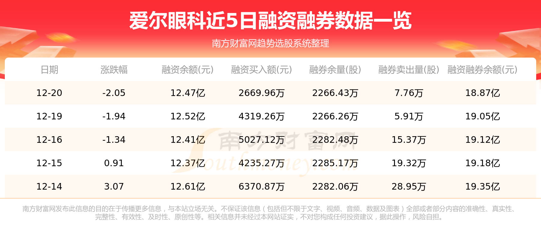 爱尔眼科12月20日融券信息显示,融资方面,当日融资买入2669.96万元,融资偿还3142.46万元,融资净买额-472.5万元。融券方面,融券卖出7.76万股,融券偿还7.59万股,融券余量2266.43万股,融券余额6.4亿元。融资融券余额18.87亿元。