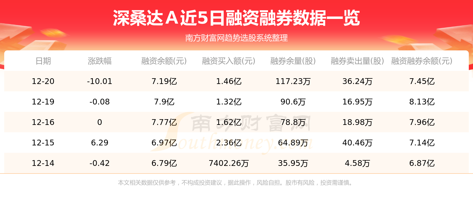 深桑达A12月20日融券信息显示,融资方面,当日融资买入1.46亿元,融资偿还2.18亿元,融资净买额-7182.75万元。融券方面,融券卖出36.24万股,融券偿还9.61万股,融券余量117.23万股,融券余额2655.17万元。融资融券余额7.45亿元。近5日融资融券数据一览见下表: