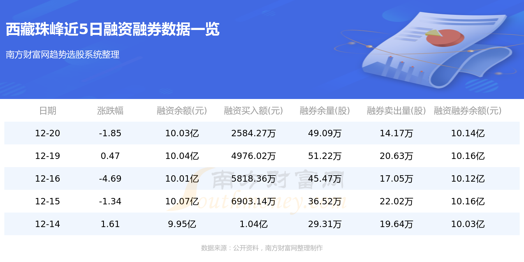 西藏珠峰12月20日融券信息显示,融资方面,当日融资买入2584.27万元,融资偿还2672.5万元,融资净买额-88.23万元。融券方面,融券卖出14.17万股,融券偿还16.3万股,融券余量49.09万股,融券余额1121.64万元。融资融券余额10.14亿元。近5日融资融券数据一览见下表: