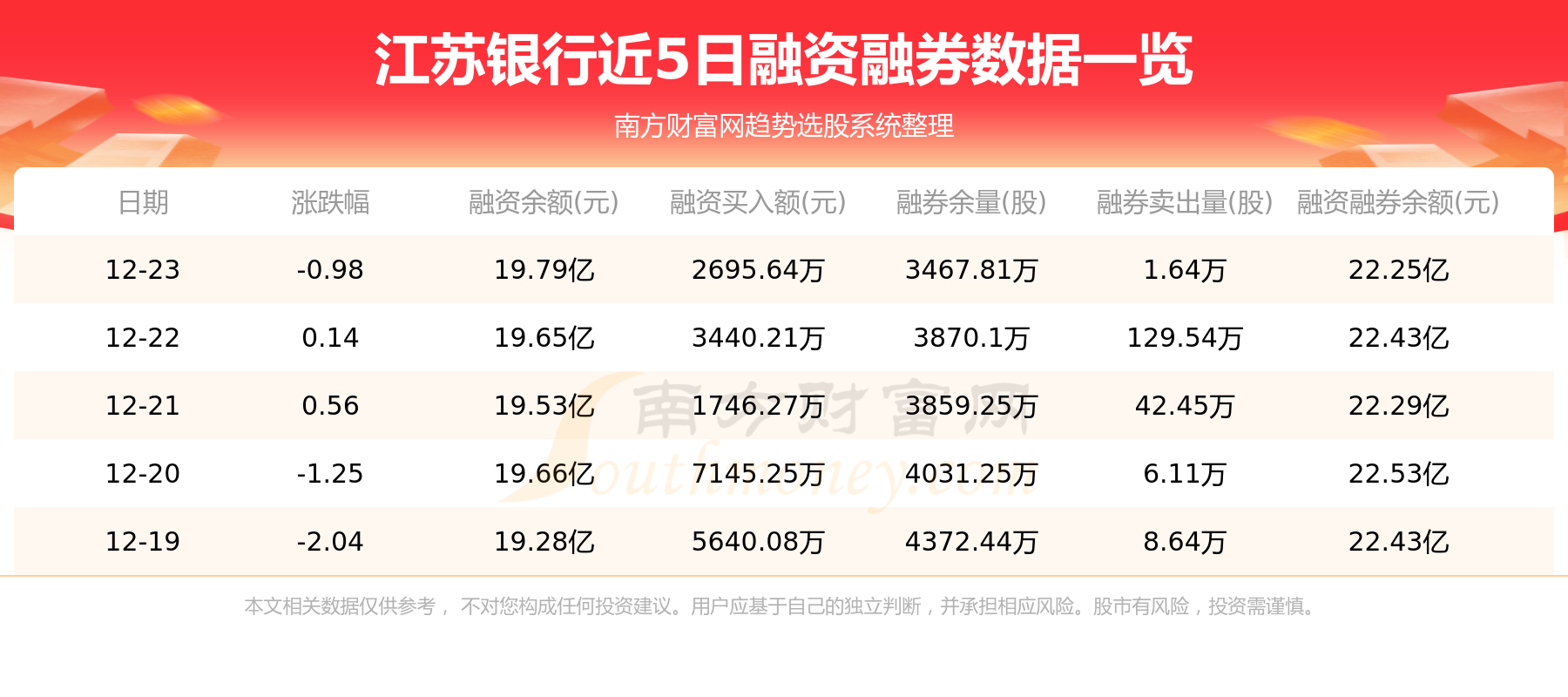 江苏银行12月23日融券信息显示,融资方面,当日融资买入2695.64万元,融资偿还1292.94万元,融资净买额1402.7万元。融券方面,融券卖出1.64万股,融券偿还403.93万股,融券余量3467.81万股,融券余额2.46亿元。融资融券余额22.25亿元。近5日融资融券数据一览见下表: