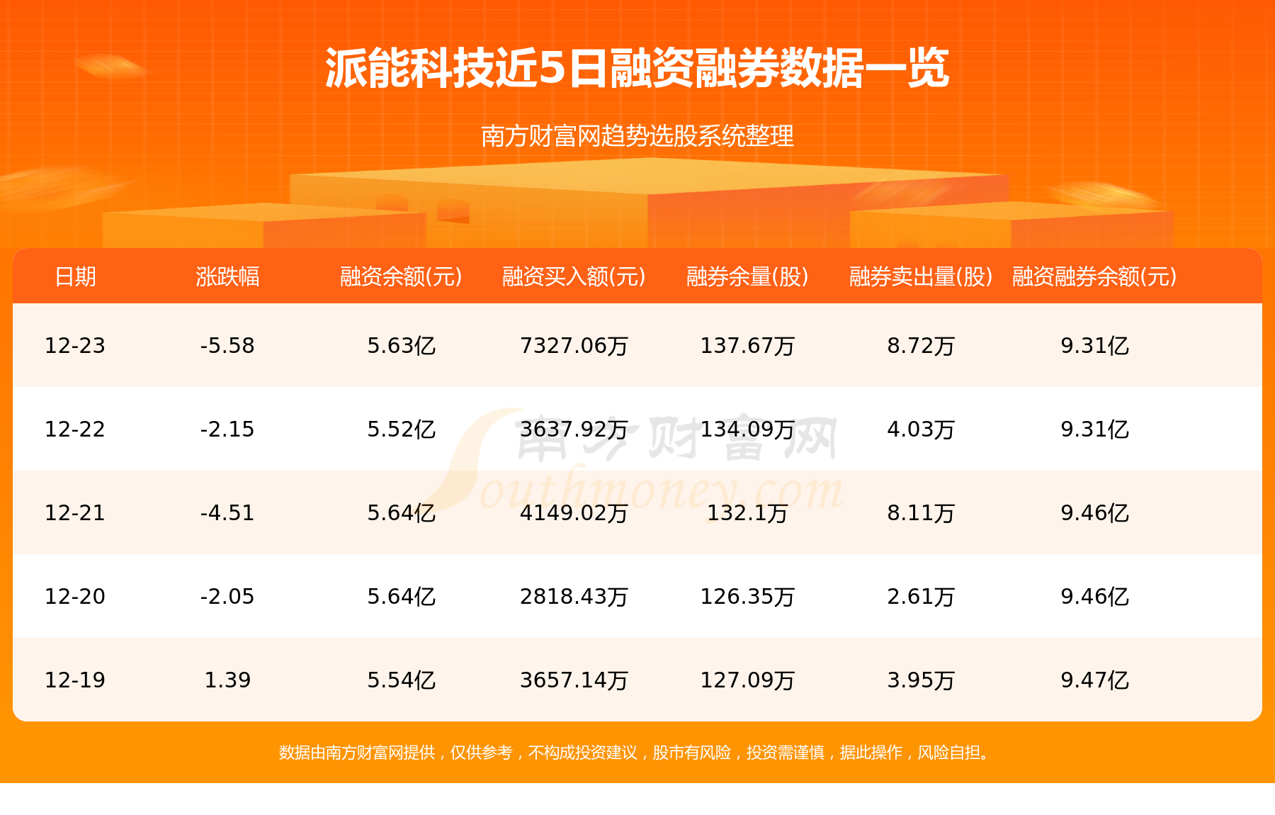 12月23日派能科技融券信息显示,融资方面,当日融资买入7327.06万元,融资偿还6195.68万元,融资净买额1131.39万元。融券方面,融券卖出8.72万股,融券偿还5.14万股,融券余量137.67万股,融券余额3.68亿元。融资融券余额9.31亿元。近5日融资融券数据一览见下表: