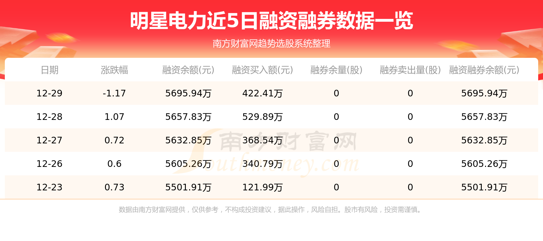 12月29日明星电力融券信息显示,融资方面,当日融资买入422.41万元,融资偿还384.3万元,融资净买额38.11万元。近5日融资融券数据一览见下表: