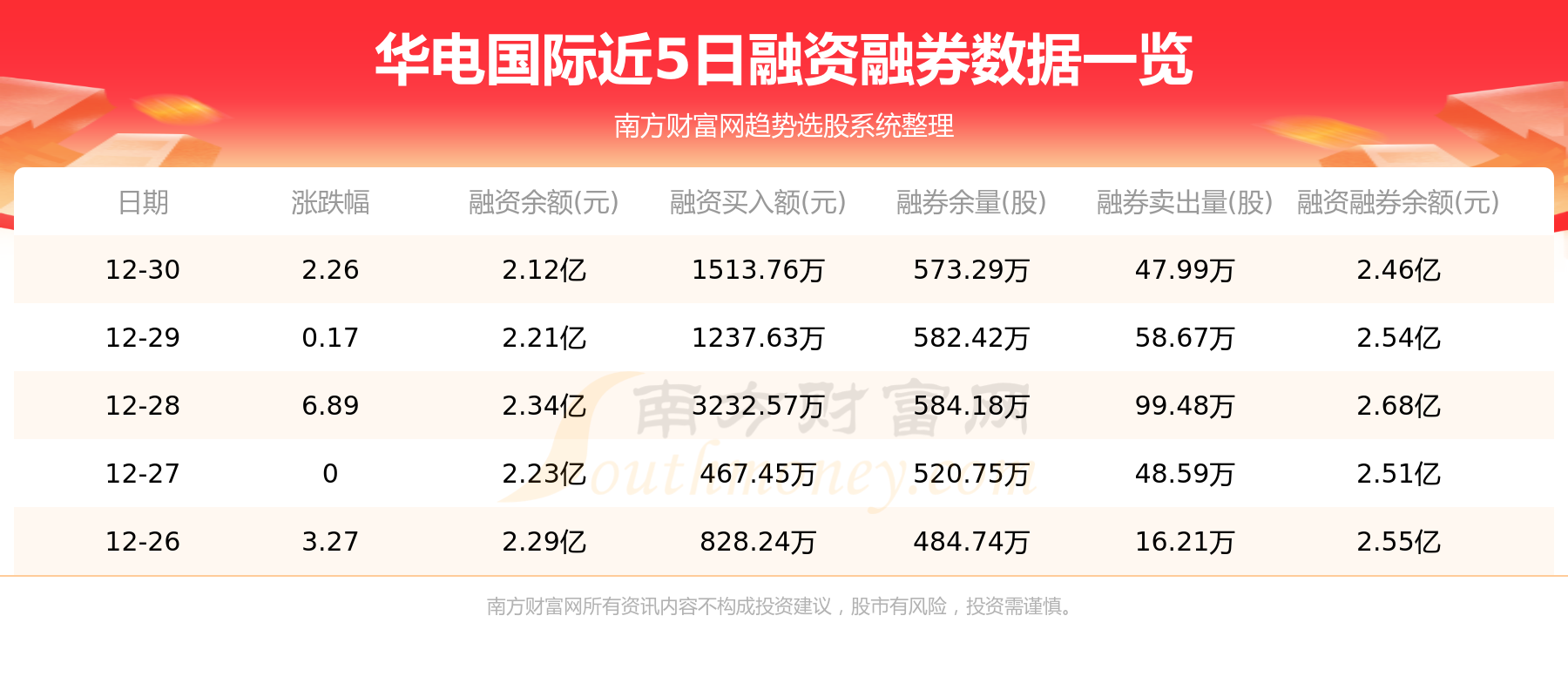 12月30日华电国际融券信息显示,融资方面,当日融资买入1513.76万元,融资偿还2374.23万元,融资净买额-860.47万元。融券方面,融券卖出47.99万股,融券偿还57.12万股,融券余量573.29万股,融券余额3370.96万元。融资融券余额2.46亿元。近5日融资融券数据一览见下表: