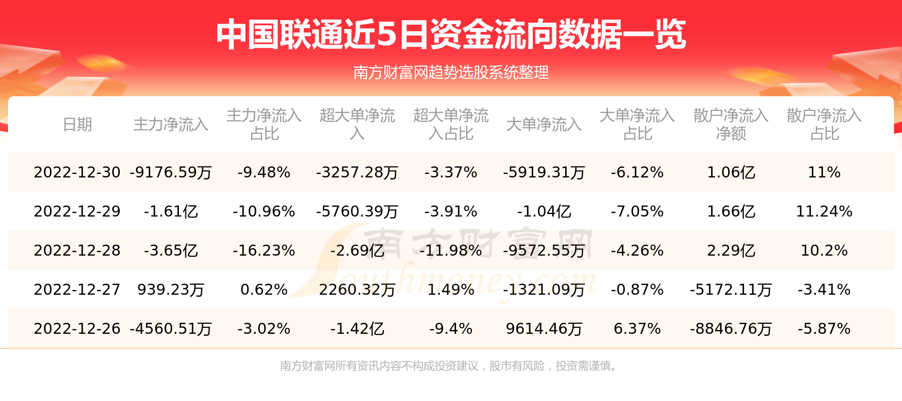 12月30日消息,中国联通主力净流出9176.59万元,超大单净流出3257.28万元,散户净流入1.06亿元。