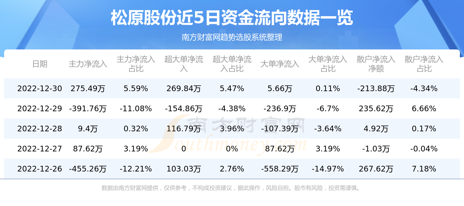 12月30日消息,松原股份12月30日主力资金净流入275.49万元,超大单资金净流入269.84万元,大单资金净流入5.66万元,散户资金净流出213.88万元。