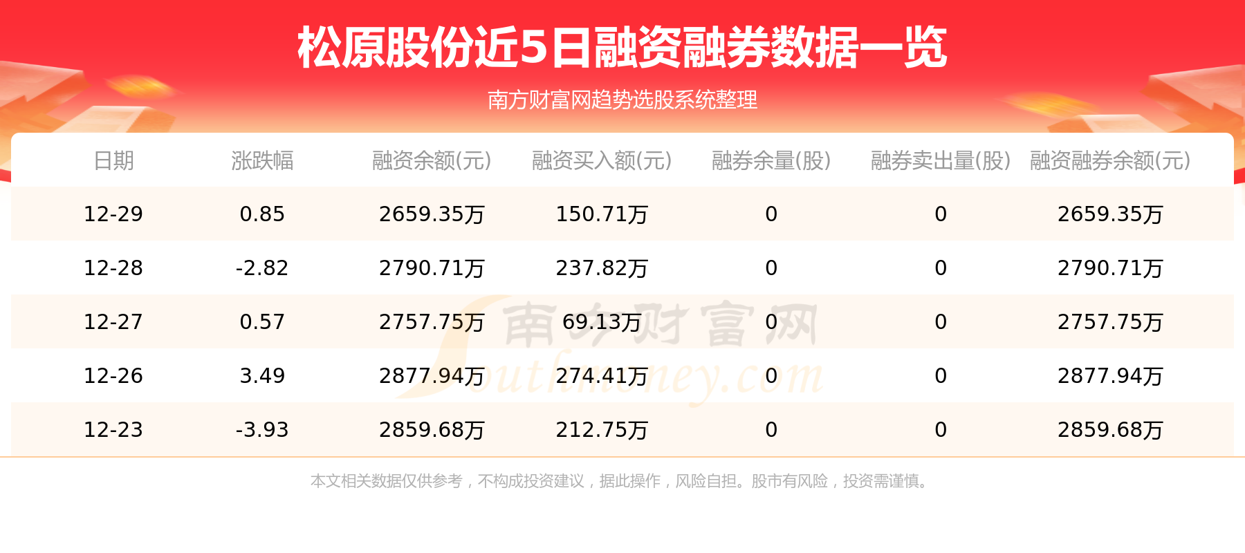 松原股份12月29日融券信息显示,融资方面,当日融资买入150.71万元,融资偿还282.06万元,融资净买额-131.36万元。近5日融资融券数据一览见下表: