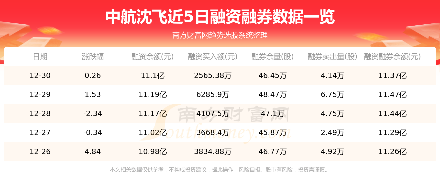 中航沈飞12月30日融券信息显示,融资方面,当日融资买入2565.38万元,融资偿还3465.1万元,融资净买额-899.72万元。融券方面,融券卖出4.14万股,融券偿还6.16万股,融券余量46.45万股,融券余额2723.18万元。融资融券余额11.37亿元。近5日融资融券数据一览见下表: