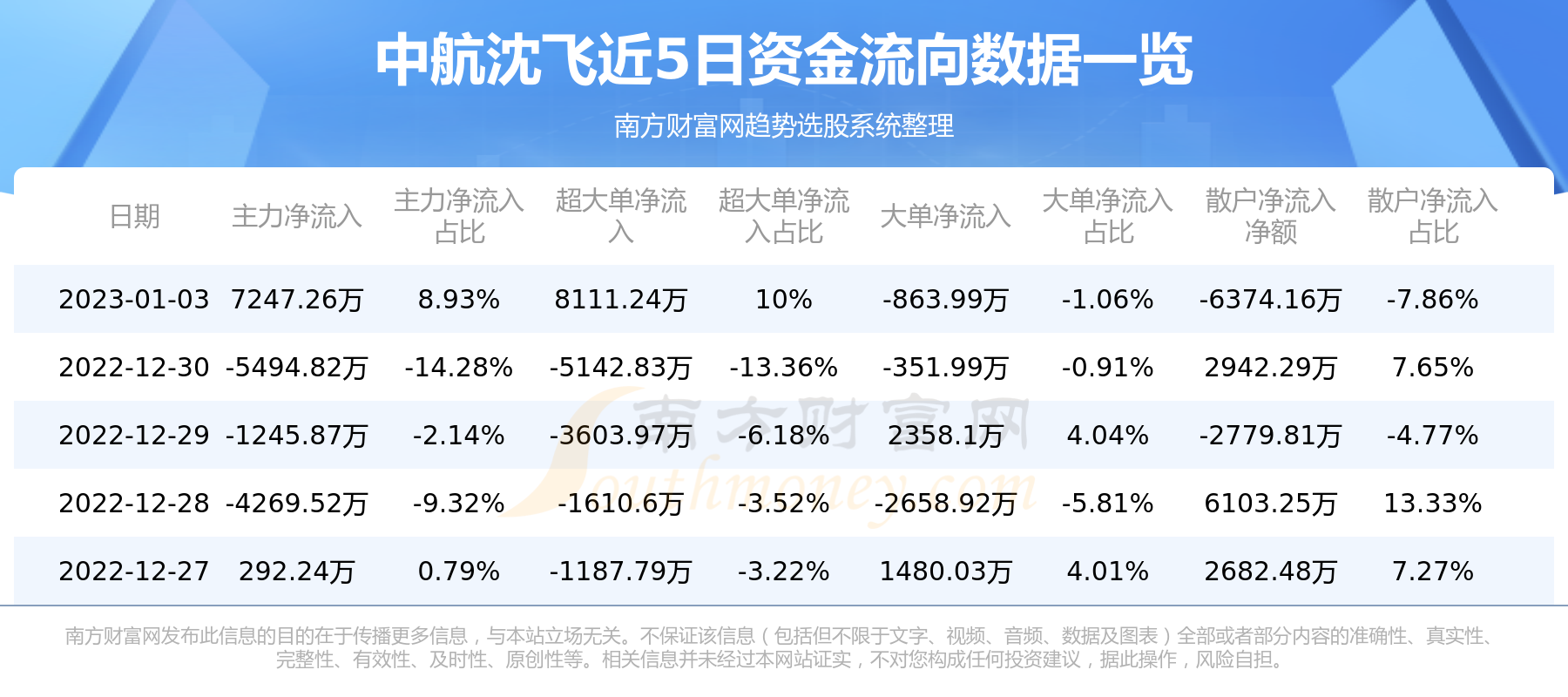 1月3日消息,中航沈飞1月3日主力净流入7247.26万元,超大单净流入8111.24万元,大单净流出863.99万元,散户净流出6374.16万元。