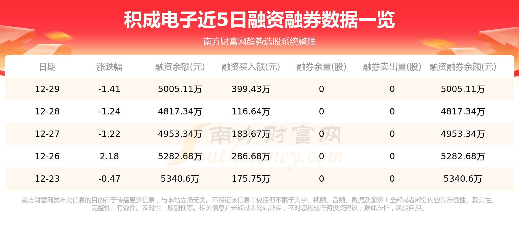 12月29日积成电子融券信息显示,融资方面,当日融资买入399.43万元,融资偿还211.67万元,融资净买额187.77万元。