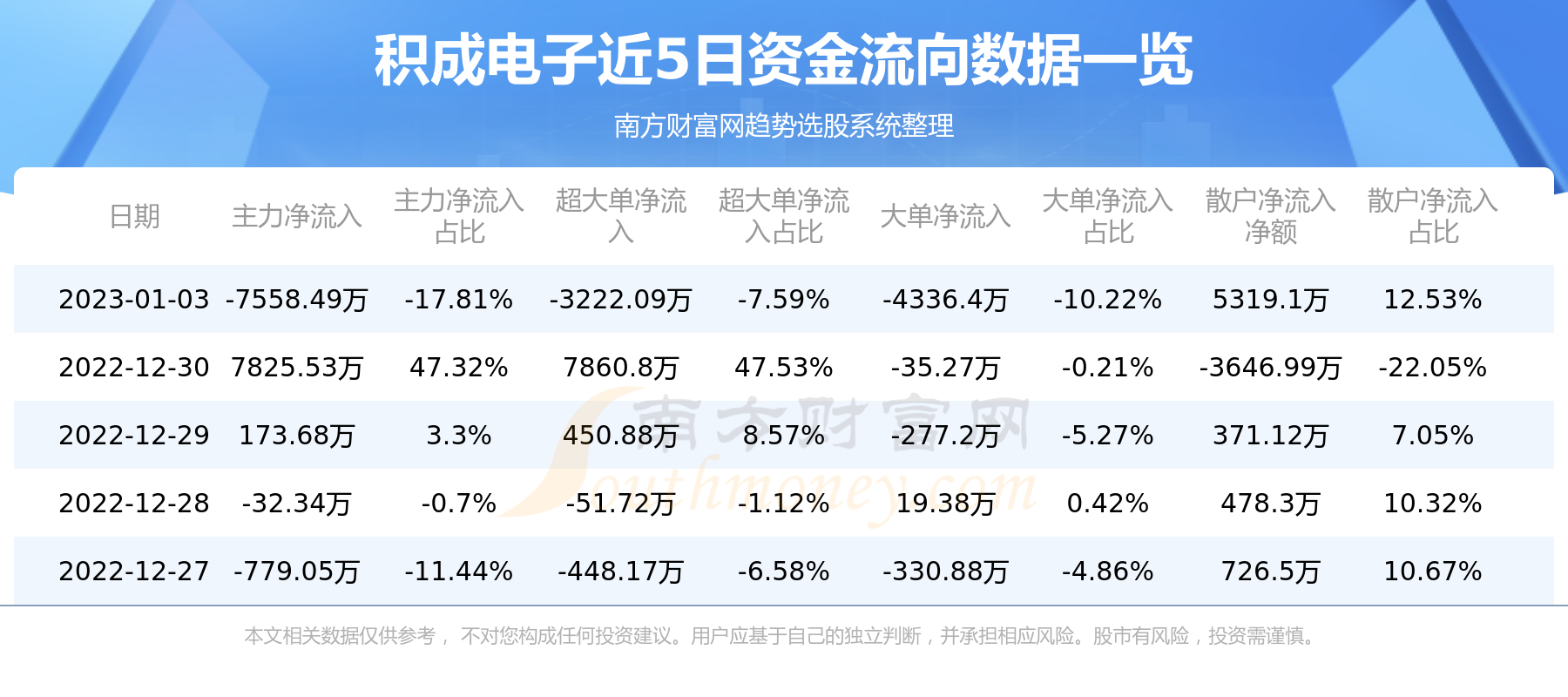 以上就是网络对上海配资平台 积成电子1月3日主力资金净流出7558.49万元的解读(https://www.youge168.com/news-pzhq/45641.html)希望可以帮助您。