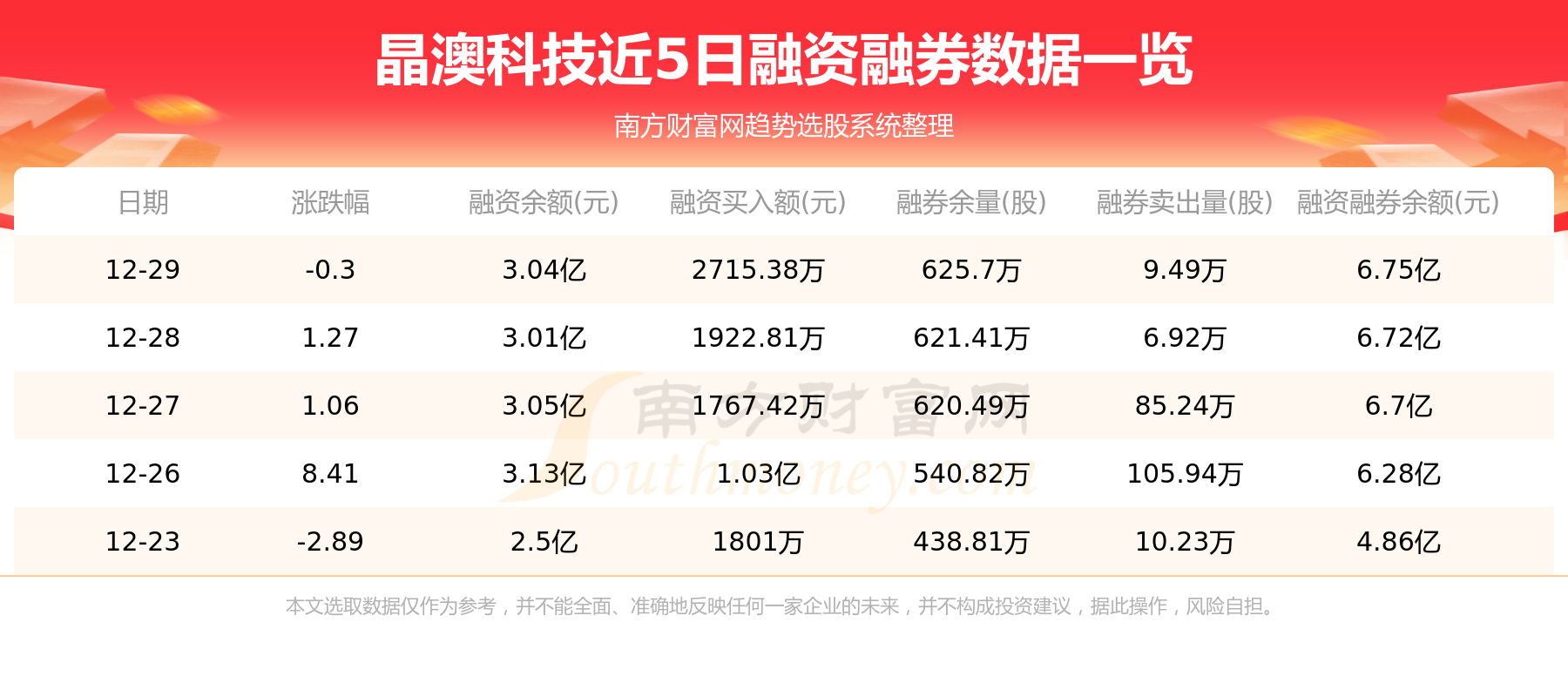 晶澳科技12月29日融券信息显示,融资方面,当日融资买入2715.38万元,融资偿还2489.18万元,融资净买额226.19万元。融券方面,融券卖出9.49万股,融券偿还5.2万股,融券余量625.7万股,融券余额3.72亿元。融资融券余额6.75亿元。
