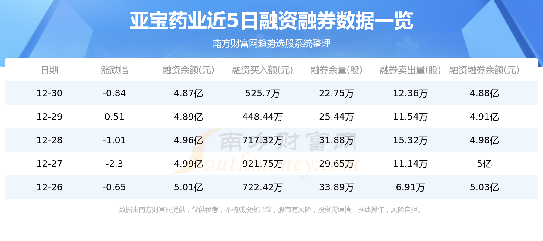 12月30日亚宝药业融券信息显示,融资方面,当日融资买入525.7万元,融资偿还732.2万元,融资净买额-206.5万元。融券方面,融券卖出12.36万股,融券偿还15.05万股,融券余量22.75万股,融券余额133.8万元。融资融券余额4.88亿元。近5日融资融券数据一览见下表: