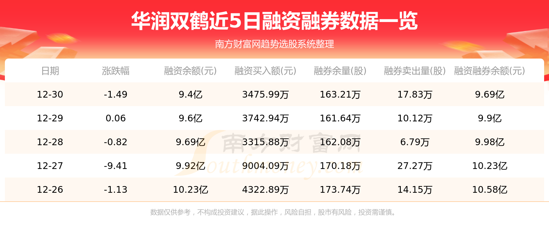 12月30日华润双鹤融券信息显示,融资方面,当日融资买入3475.99万元,融资偿还5520.06万元,融资净买额-2044.07万元。融券方面,融券卖出17.83万股,融券偿还16.26万股,融券余量163.21万股,融券余额2919.88万元。融资融券余额9.69亿元。近5日融资融券数据一览见下表: