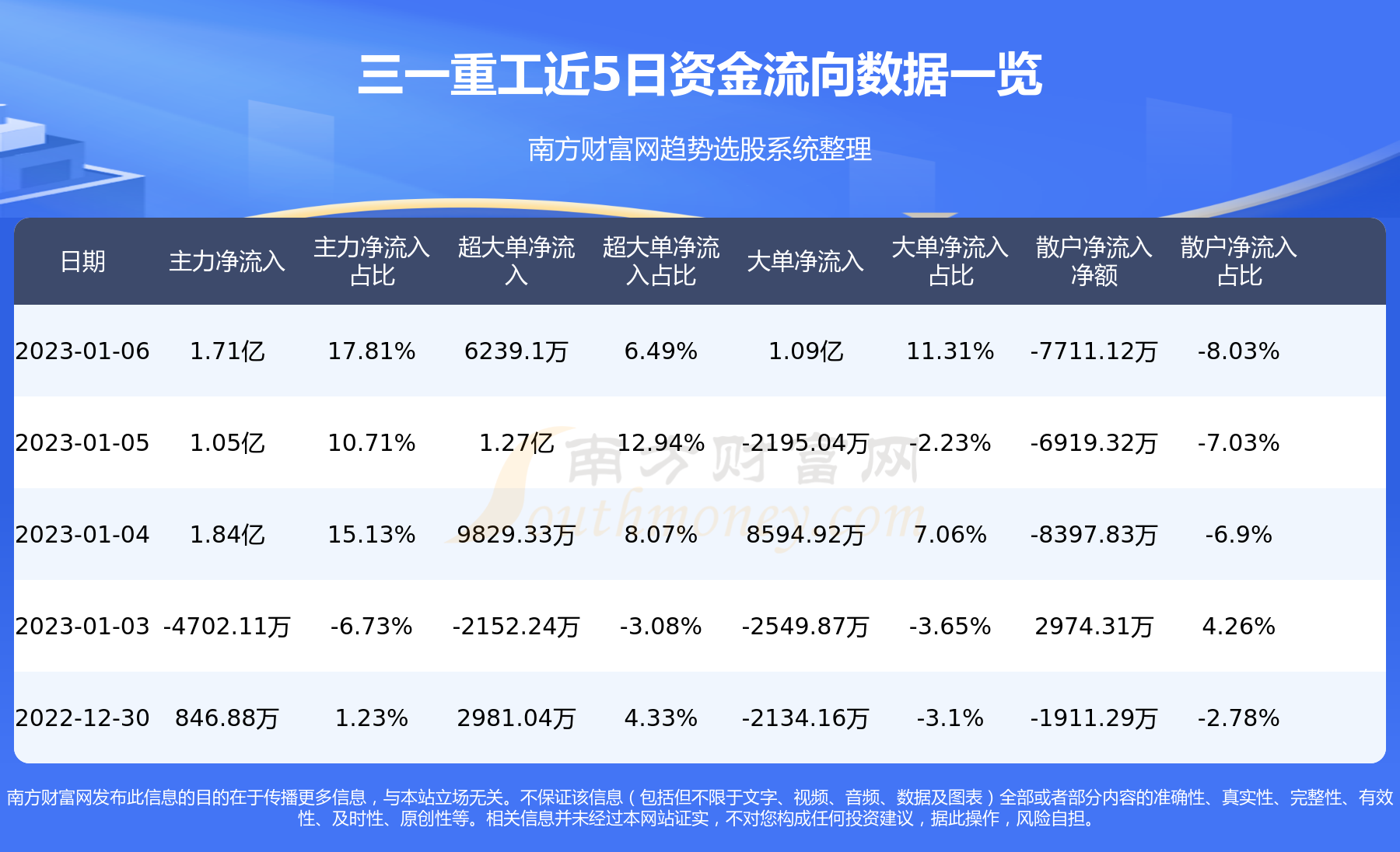 1月6日消息,三一重工资金净流入1.71亿元,超大单资金净流入6239.1万元,换手率0.68%,成交金额9.51亿元。
