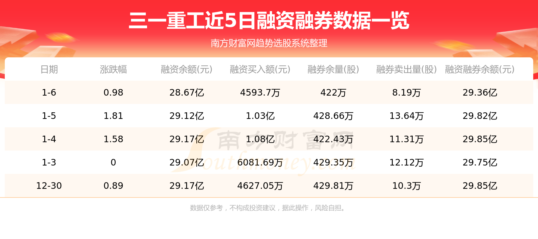 1月6日三一重工融券信息显示,融资方面,当日融资买入4593.7万元,融资偿还9117.82万元,融资净买额-4524.12万元。融券方面,融券卖出8.19万股,融券偿还14.85万股,融券余量422万股,融券余额6962.97万元。融资融券余额29.36亿元。近5日融资融券数据一览见下表: