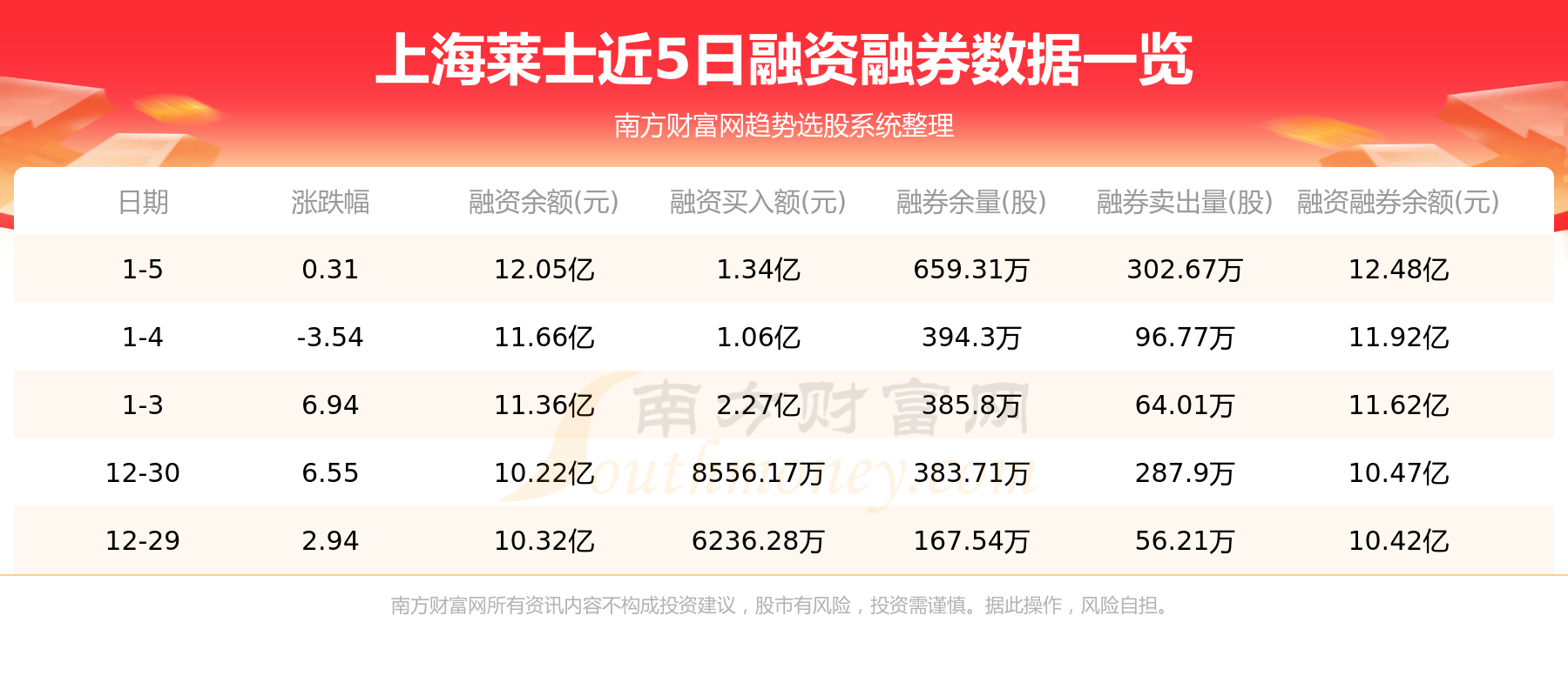 1月5日上海莱士融券信息显示,融资方面,当日融资买入1.34亿元,融资偿还9455.6万元,融资净买额3910.24万元。融券方面,融券卖出302.67万股,融券偿还37.67万股,融券余量659.31万股,融券余额4325.05万元。融资融券余额12.48亿元。近5日融资融券数据一览见下表: