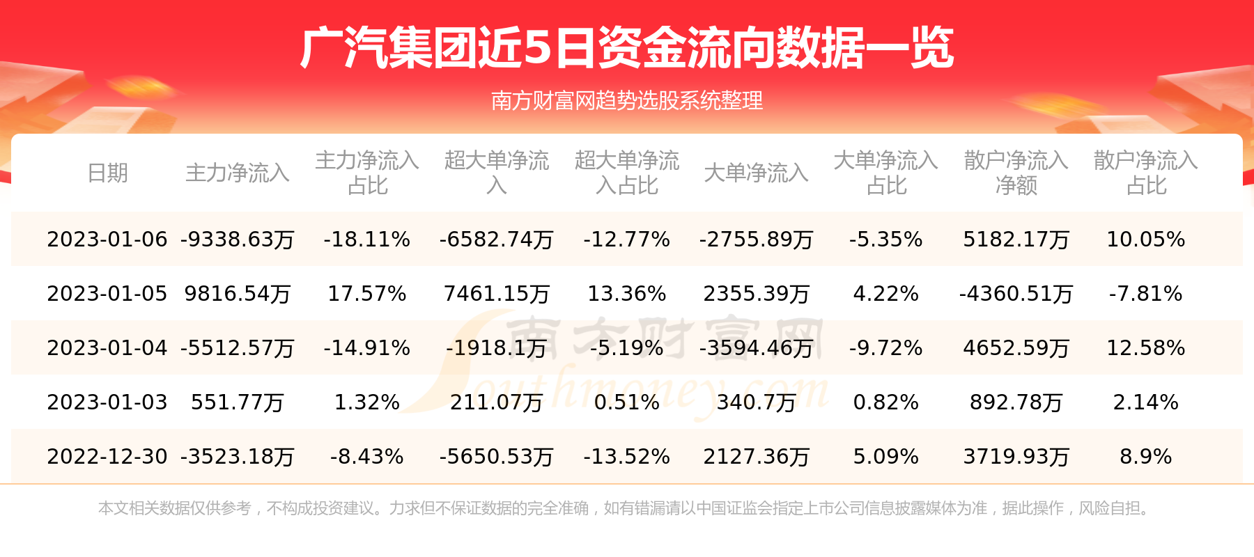 1月6日消息,广汽集团资金净流出9338.63万元,超大单净流出6582.74万元,换手率0.63%,成交金额5.16亿元。