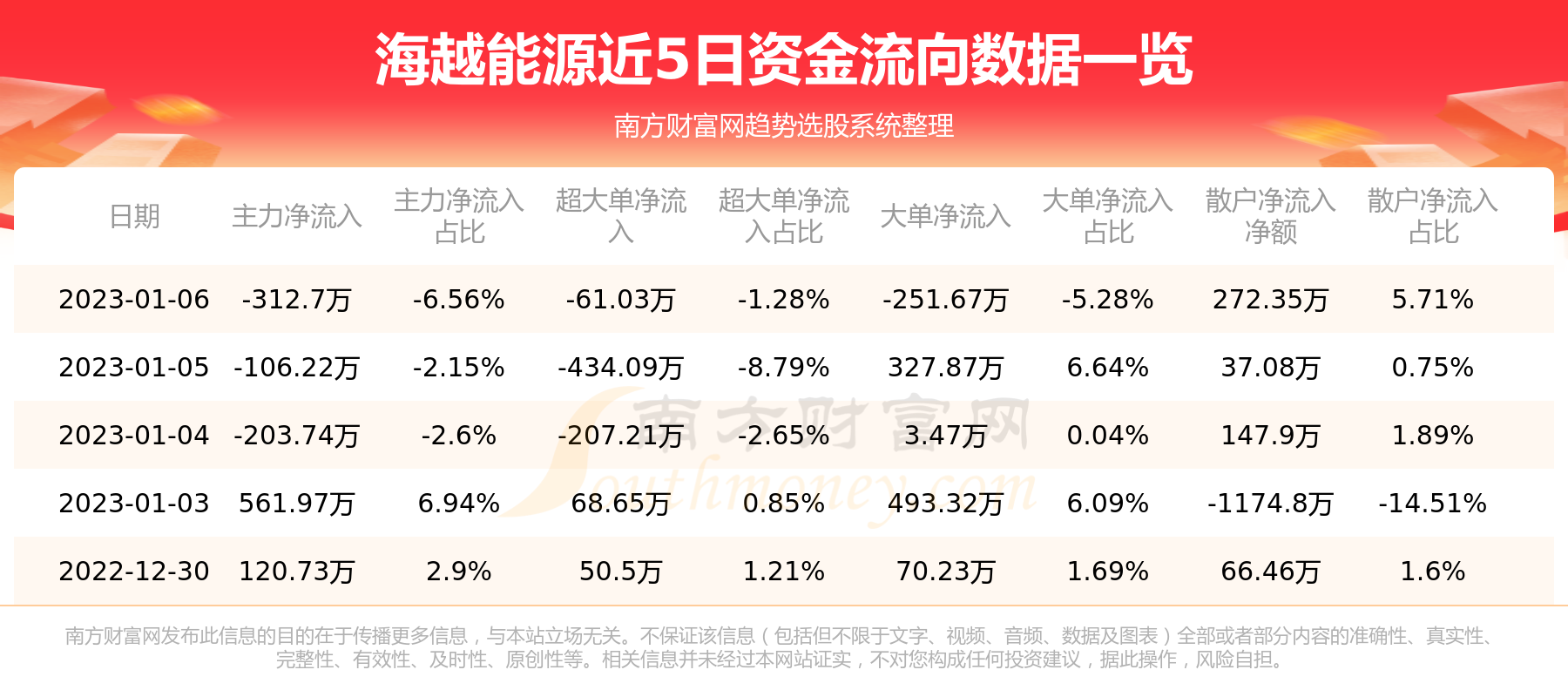 1月6日消息,海越能源1月6日主力净流出312.7万元,超大单净流出61.03万元,大单净流出251.67万元,散户净流入272.35万元。