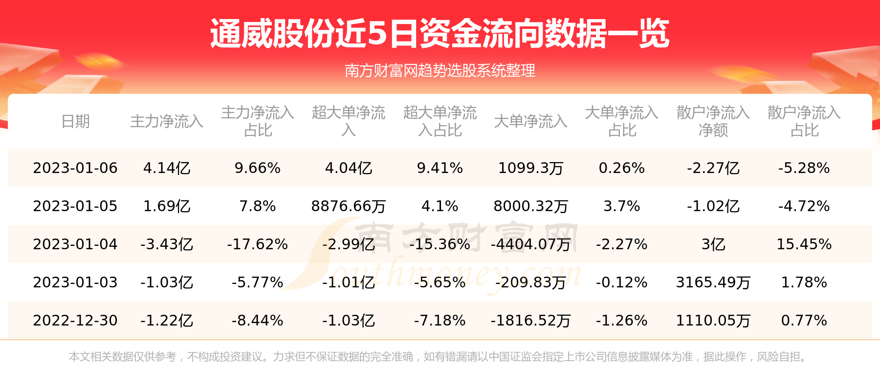 1月6日消息,通威股份1月6日主力资金净流入4.14亿元,超大单资金净流入4.04亿元,大单资金净流入1099.3万元,散户资金净流出2.27亿元。