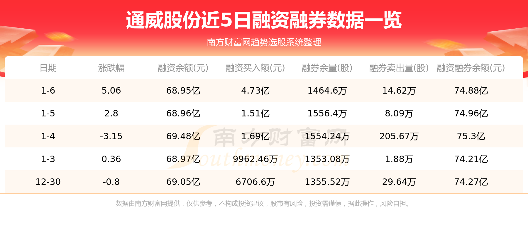 1月6日通威股份融券信息显示,融资方面,当日融资买入4.73亿元,融资偿还4.74亿元,融资净买额-97.9万元。融券方面,融券卖出14.62万股,融券偿还106.42万股,融券余量1464.6万股,融券余额5.93亿元。融资融券余额74.88亿元。近5日融资融券数据一览见下表: